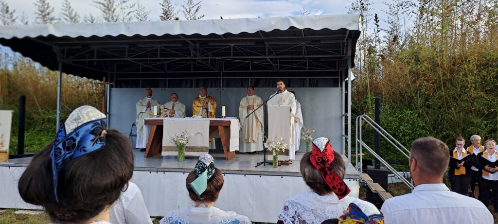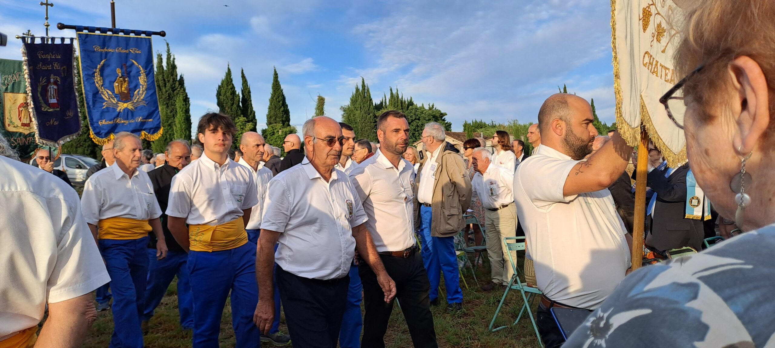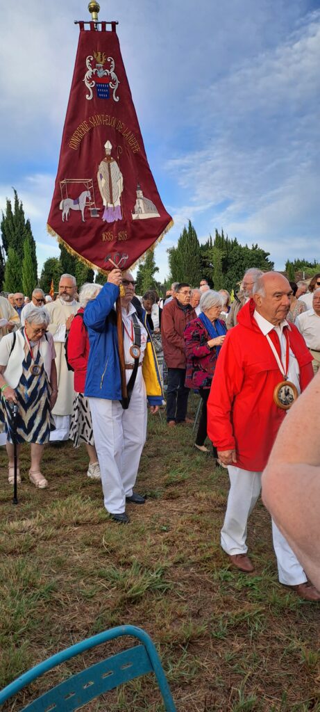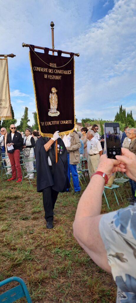 On the sunday morning, at 6 o’clock, the car park of the hotel was busy, to drive to Le Mas des Bayles, where Mgr Delabre, archbishop of Aix en Provence, was going to celebrate the mass. Fortunately, the sun of Provence was shining bright to welcome all the brotherhoods with their banners, their traditional dress such as the beautiful Arlesiennes, or our friends from Belgium, or the « Charitables »….